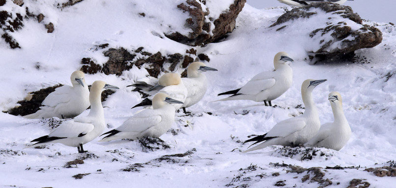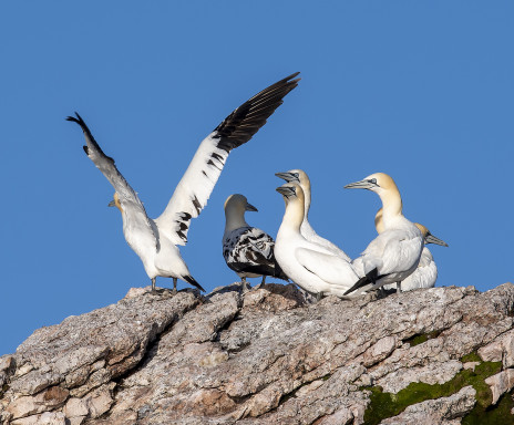 Der Basstölpel ist ein großer, stromlinienförmiger Vogel mit langen, schmalen Flügeln. Der typische gelbe Kopf ist bei erwachsenen Vögeln (4-6 Jahre) leicht zu erkennen. Der Basstölpel ist bekannt für seine spektakulären Sturztauchgänge. Aus großer Höhe stürzt er sich mit unglaublicher Präzision ins Meer, um Fische zu fangen – ein beeindruckendes Schauspiel für alle, die es miterleben dürfen. Auf dem Weg zur Kolonie kannst du auch andere faszinierende Seevögel entdecken und mit etwas Glück sogar Wale oder neugierige Robben beobachten, die ihre Köpfe aus dem Wasser strecken.