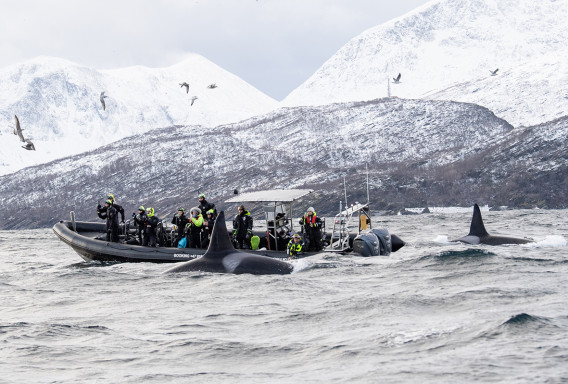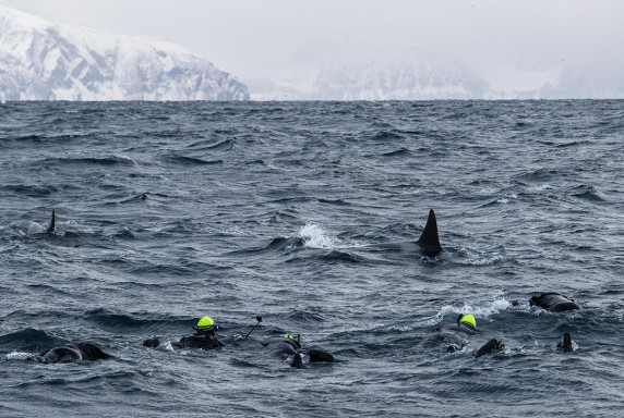 Du kan bli med oss i området Skjervøy fra november til januar for snorkling med spekkhoggere og knølhval. Er vi riktig heldig kan vi også observere finhval og smermhval. Hvalene følger silda, og denne årstiden er et eldorado her nord. Å se disse fascinerende hvalene på nært hold under vann er en opplevelse en gang i livet. Vi tilbyr tørrdrakter og snorkelutstyr, men du er også velkommen til å ta med eget.